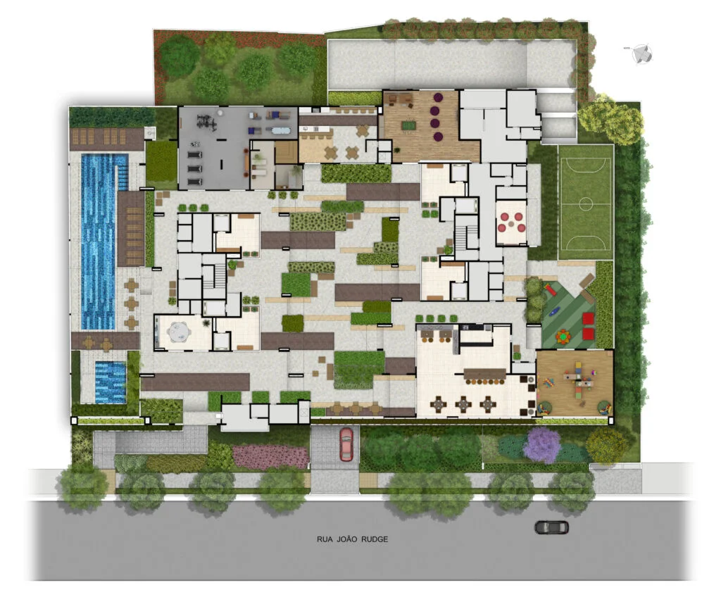 O empreendimento conta com sistemas de reaproveitamento de águas pluviais para irrigação e uso nas áreas comuns, reduzindo significativamente o consumo de água potável. A eficiência energética é priorizada por meio da iluminação LED e sensores de presença, além do aproveitamento da luz natural. Já o conforto ambiental é garantido pelo uso de materiais que melhoram o isolamento térmico e acústico, minimizando a necessidade de climatização artificial.